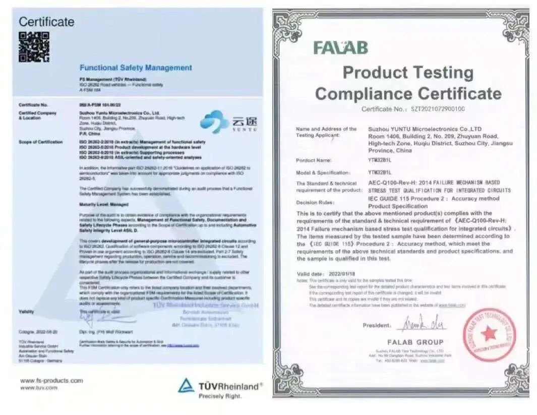 左图(功能安全ASIL D证书),右图(AEC-Q100证书)