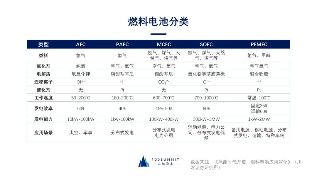 质子交换膜燃料电池运行温度低、启动快,主要应用在交通领域;固体氧化物燃料电池运行温度高、启动慢、铂金属使用少,可用于固定式发电。