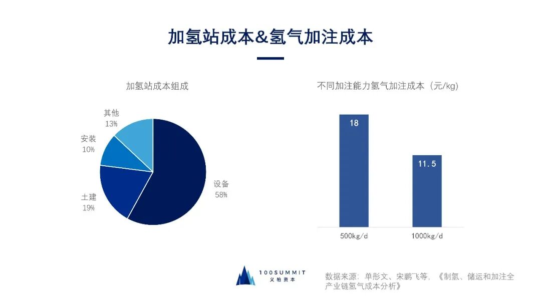 加氢站建设成本方面,根据《制氢、储运和加注全产业链氢气成本分析》(单彤文、宋鹏飞等)研究分析,不含土地投资情况下,35MPa 500kg/d的加氢站的投资约1200-1500万元,1000kg/d的加氢站投资约2000-2500万元,其中设备及土建的投资占约70%以上;加上运营成本,加氢站加注成本约为18元/kg(500kg/d)和11.5元/kg(1000kg/d)。当前加氢站建设成本高,相当于传统加油站的3倍。前期加氢站建设离不开政府补贴的支持,长远来看取决于投资成本、运营成本和运行负荷。
