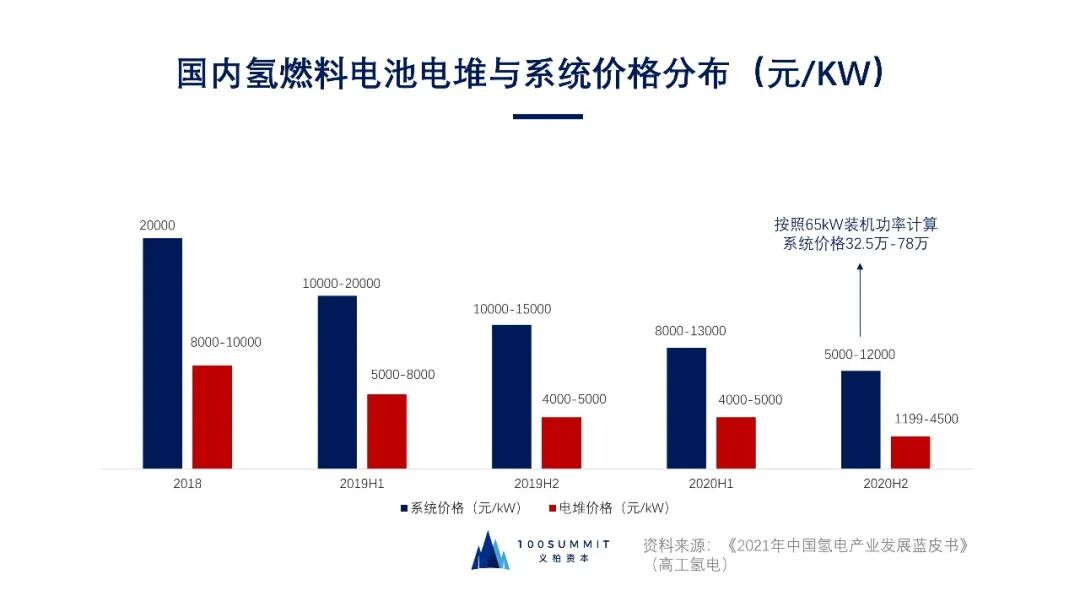 现阶段,氢燃料电池价格高昂是产业未能商业化的主要原因之一,但成本已经开始下降。2019年下半年-2020年上半年,随着产业链竞争加剧及产业链不断完善,上海捷氢、重塑科技、清能股份等企业快速拓展市场,在一定采购量支持下,系统价格分布在8000-13000元/kW;电堆价格分布在4000-5000元/kW;2020年10月18日,国鸿氢能产品发布会上,电堆战略合作售价为1999元/kW,将国内氢燃料电池产业带入快速降价阶段。