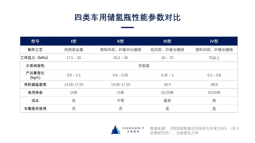 车用储氢瓶主要分为4种:纯金属瓶(I型)、金属内胆纤维环向缠绕瓶(II型)、铝内胆纤维全缠绕瓶(III型瓶)和塑料内胆纤维全缠绕瓶(IV型瓶)。I型、II型储氢密度低、安全性能差,难以满足车辆储氢密度要求,III型IV型瓶具有安全性高、重量轻、储氢密度高等优点被广泛使用。
