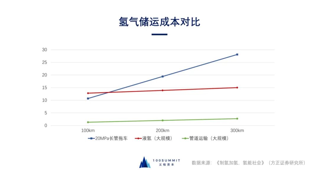按照中华人民共和国交通运输行业标准《JT/T617.1-2018危险货物道路运输规则》,长管拖车和瓶组运输使用长管拖车,运输储存压力为20MPa。随着运输距离增加,经济性下降,经济运输半径100-150km;相比之下,长距离运输情况下,液氢运输成本优势出现。管道运输成本低,但管道运输前期投资建设成本高,在氢能产业成熟之前有风险较大,且需要防止氢脆问题。