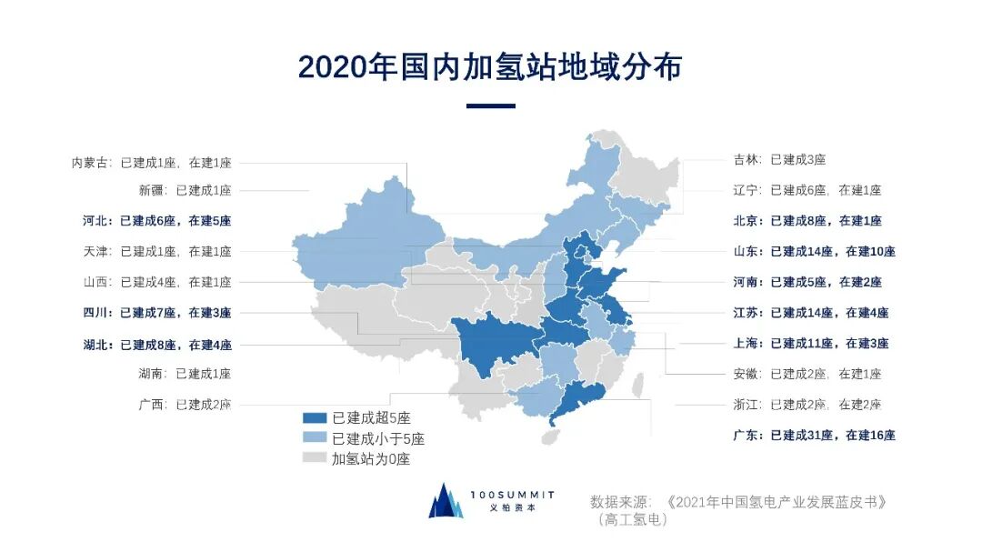 加氢站是连接上游氢气和下游燃料汽车用户的纽带。IEA数据显示,截至2020年底,全球累计的加氢站数量为540座,同比增长15.38%。日本、德国、中国、美国、韩国的加氢站数量分别为137、90、85、63、52座,建设数量居于全球前列。国内加氢站从地区分布来看,已运营站点主要分布在广东、山东、江苏、上等地区。