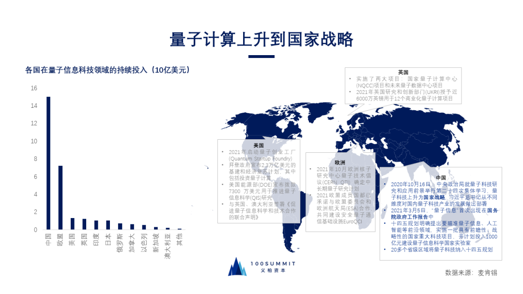 除此之外,量子信息科技也被多国政府当作重要的国家战略布局方向,根据McKinsey统计,目前计划投入超过50亿美元资金用于支持量子信息科技发展的国家(地区)的政府已有9个,其中,中国计划投入约150亿美元,超过其他所有国家(地区)的投入之和。