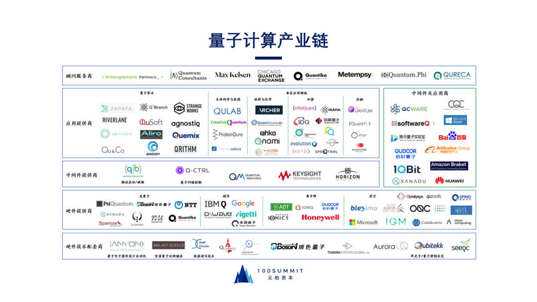 随着众多玩家和资本入场,全球范围内量子计算的产业链逐步成型,主要由底层硬件提供商和技术配套商、中层中间件提供商和下游应用商共同构成,同时伴随着不同物理方案样机的推出和云服务接入,应用端也演化出一批针对行业的专门软件算法开发商。但国内方面,由于起步较晚,产业链分工尚不明确,大量初创公司集中于硬件供应层面,并同时与终端行业客户合作探索实用的量子算法。此外,国内的互联网巨头公司在量子计算方面的布局主要专注于中间件和应用层算法的开发,未来有望与量子计算初创公司形成产业协同。