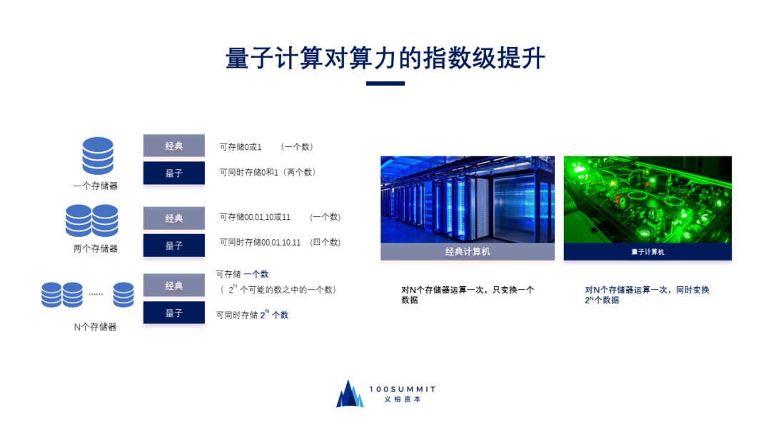 因此,量子存储器的存储数据能力是经典的2的N次方倍,且随N指数增长。例如,N=250时量子存储器可同时存储比宇宙中原子数目还要多的数据。