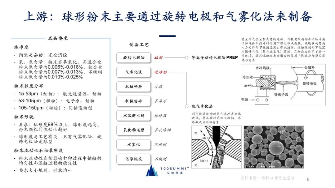 从工艺方面划分,当前全球主流的3D打印金属粉末制备方法包括:气雾化法(GA)、等离子旋转电极法(PREP)、等离子雾化法(PA),以及等离子球化法(PS)等。