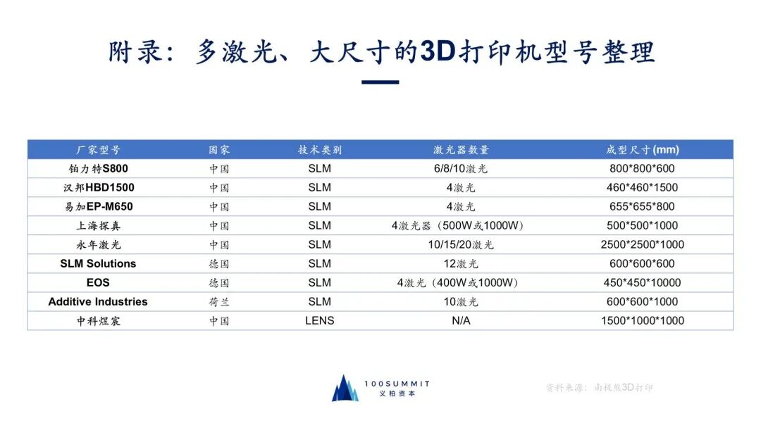 向超大尺寸和精密件的场景探索:随着3D打印工艺的成熟,越来越多的航空、航天、重大机械对工艺的要求向大型件一次成型、精密件高效打印延展。目前已有多家厂商推出了米级的大尺寸打印设备。