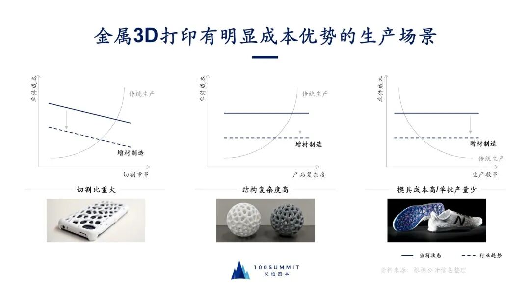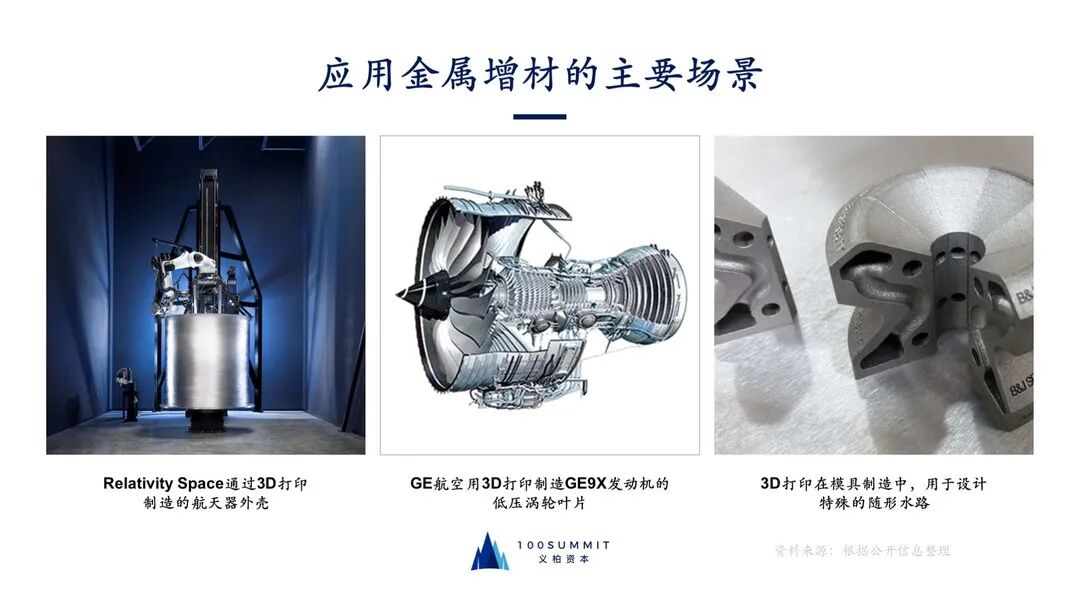 金属3D打印的主流场景仍旧属于一般3D打印的范围;对切割重量大、结构复杂、开模成本vs产量无法平衡的产品有显著优势。这也是其天然与航空航天、重大机械、以及医疗场景高度契合的主要原因。