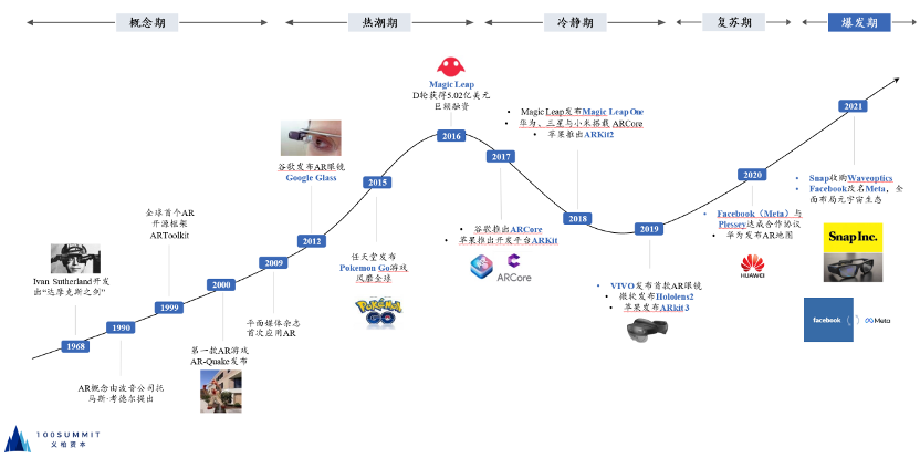 2012年至2015年:2012年从谷歌发布Google Glass起,各大初创企业与移动互联网巨头开始仓促进入AR 领域,意图抓住新的增长点以占领先机,AR设备大量涌现。Facebook、微软先后进入AR领域,Sony、三星、HTC 等多家大厂也推出相关硬件产品。