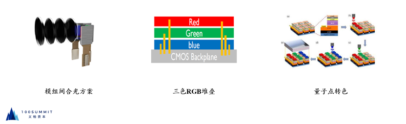 芯片级全彩分为:a) 三色RGB巨量转移;b) 三色RGB堆叠;c) 量子点转色。三色RGB巨量转移与三色RGB堆叠需要产线配合,即不仅LED芯片设计,且设备、材料端均需要突破并结合产线与供应商一起共同研发。