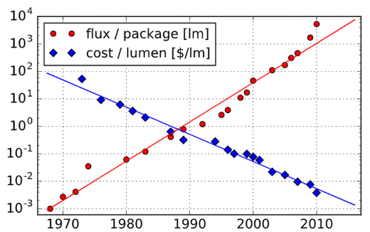 LED行业遵循海兹定律,即LED产业每18-24个月亮度提升1倍,每10年输出流明提升20倍、成本降至原来的1/10。在海兹定律驱动下,LED的升级路径沿着成本下降、尺寸缩小以及发光效率提升的方向演进。MicroLED在海兹定律或实现快速成本下降,引领下一代技术发展,在AR领域成熟及实现商业化落地。