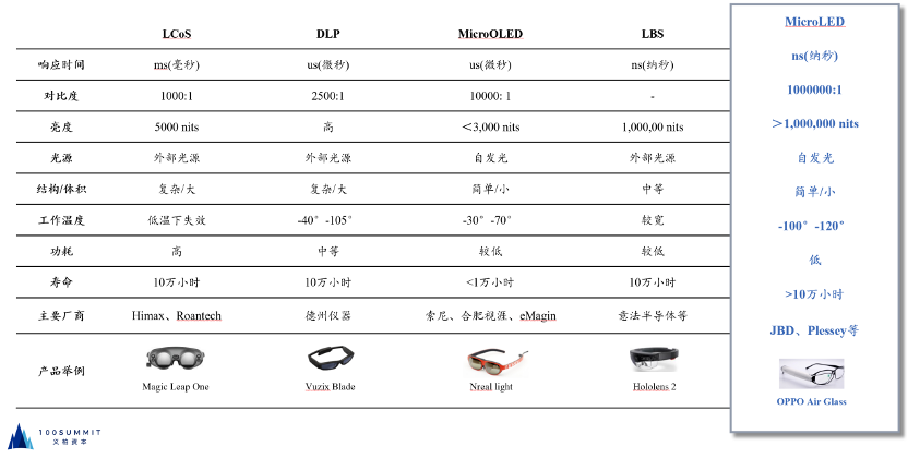 MicroLED由于像素单元低至微米量级,MicroLED显示产品具有多项性能指标优势。如MicroLED功率消耗量仅为OLED的50%,其亮度可达OLED的10倍,分辨率可达OLED的5倍,同时峰值亮度能做到百万尼特以上,被业界公认为终极显示方案,长期来看将成为AR光引擎的必然选择。