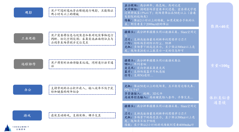 基于上图,C端场景较B端场景在产品体验与设计上有更高的要求与限制 ,所以义柏研究院认为AR消费级眼镜的理想硬件有以下关键几点: