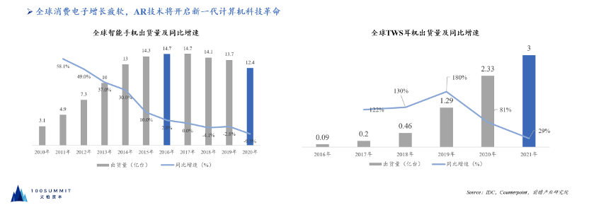 图:全球智能手机出货量与TWS耳机出货量增速下滑趋势明显