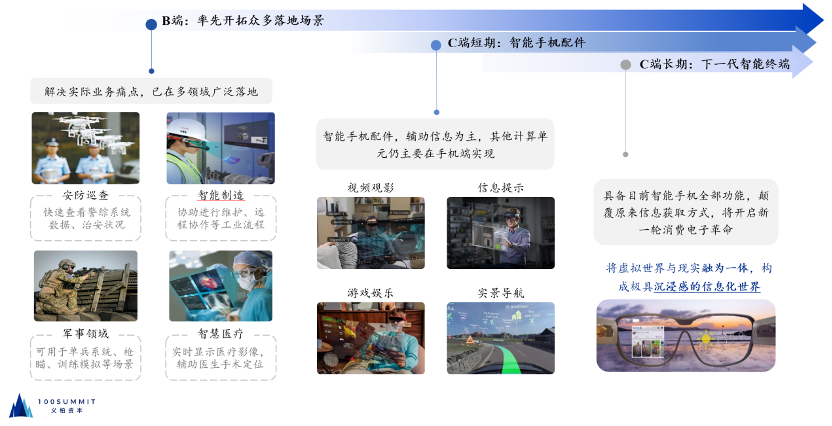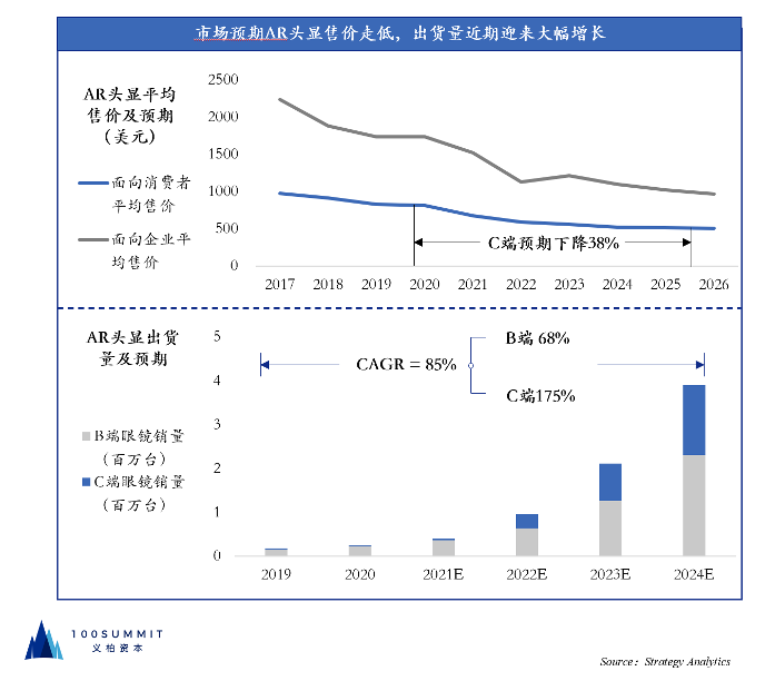 当下,AR硬件技术处于快速向终局方案迭代的阶段。预计2024年至2026年,大部分AR终端设备将降至500美元区间,符合C端消费者的心理价位并在C端市场实现广泛普及。