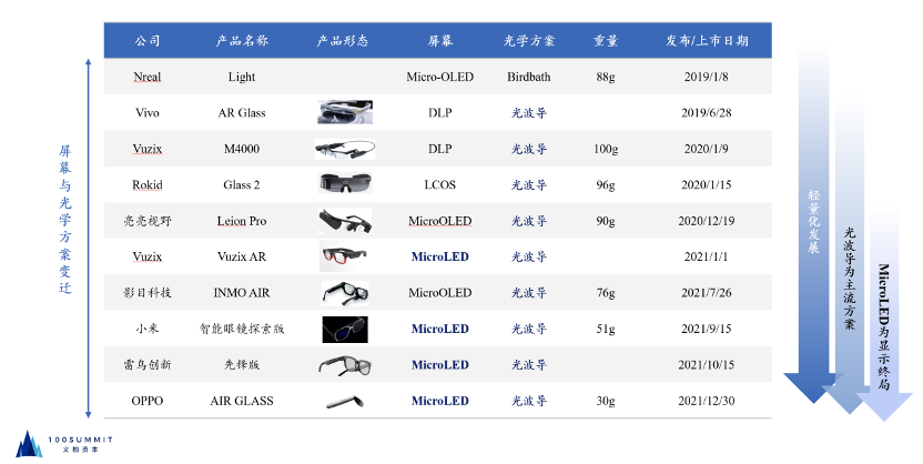 所以,AR光学方案成为AR眼镜能在室内户外全天佩戴使用的关键因素。从产品的发展规律来看,光波导+MicroLED为AR终端未来趋势,两者结合有利于打造“小、轻、薄”的AR眼镜。