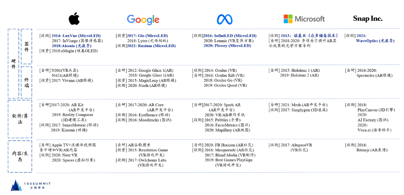 2021年以来:国内外巨头亦不再隐藏他们在AR技术上的野心,并伴随一系列的投资、收购等动作。与此同时,到了今年开局以来消费级AR眼镜的创业公司似雨后春笋般地冒了出来,当中不乏来自国内外大厂里负责AR相关项目的高管团队,不管是团队质量还是为此所做的准备都明显更胜于之前几波浪潮。一时间,整个消费级AR眼镜赛道呈现出前所未有的各大厂商“诸侯争霸”的局面,可以预见2022年或将成为消费级AR眼镜元年。