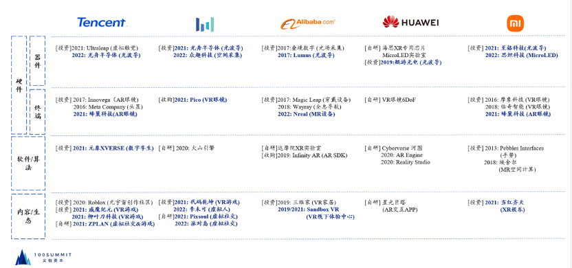 国内互联网与手机厂商加速追赶,AR布局确定性强,为必争赛道。国内厂商从原先隔江观望到纷纷下场布局,其中产业投资在过去两年明显提速和加大力度。