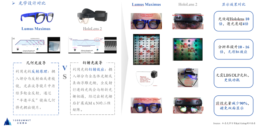 几何光波导从色彩饱和度、画面清晰度、产品功耗和量产成本等方面都占据优势,其通过几何阵列全反射原理实现图像的无损输出和画面画幅的扩大,光效超15%,因此几何光波导可搭配MicroOLED、LCoS率先实现落地与覆盖,并借助高清微显示技术可实现高亮度、色彩丰富、景深融合的全彩显示。