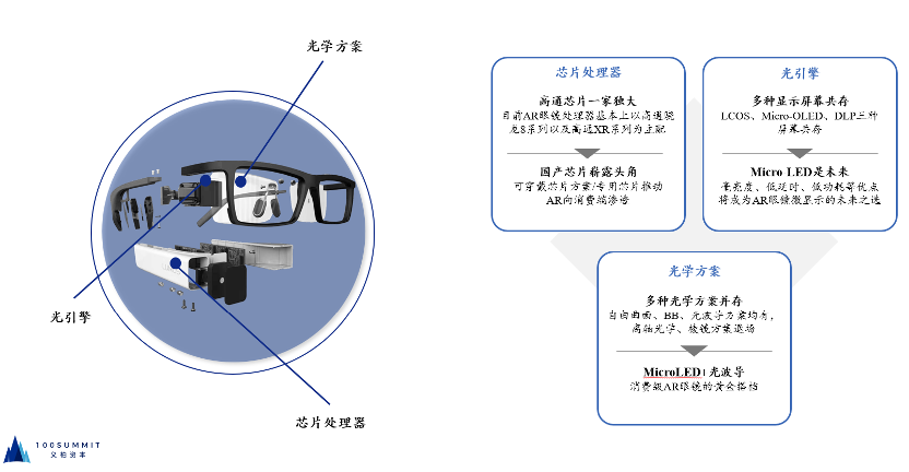 AR的普及有赖于佩戴的便捷性和使用场景的丰富性。硬件部分包括光学方案、光引擎、芯片(主控芯片及协处理器)等零部件,其升级目标是提升佩戴舒适度和显示效果。