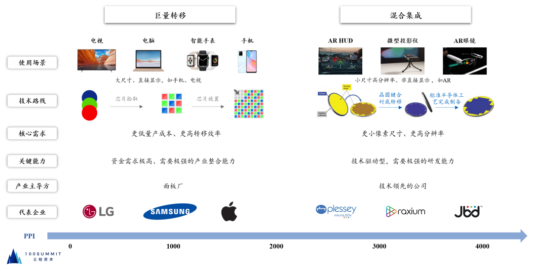 MicroLED根据制作工艺又分为巨量转移与混合集成(wafer bonding)两条路径。