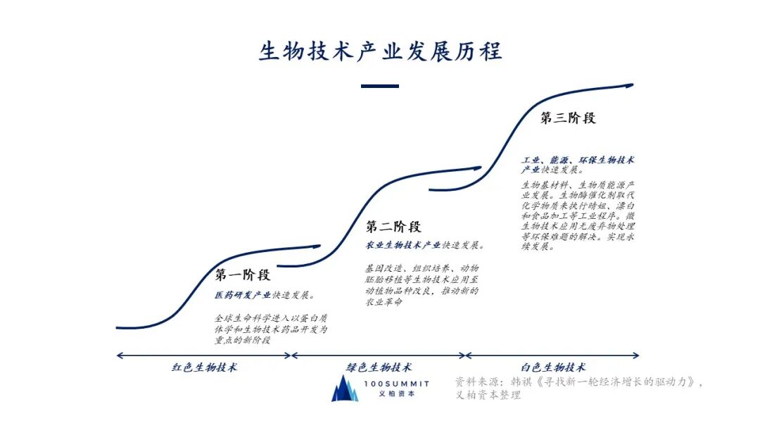 而就全球生物技术产业本身发展历程而言,发改委宏观经济研究院生物产业发展战略专家韩祺曾总结了“红色生物技术”、“绿色生物技术”、“白色生物技术”三波发展。分别指代医药研发产业;农业生物技术产业;工业、能源、环境生物技术产业。
