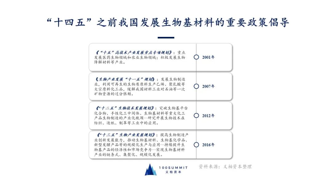 在生物经济发展的时代脉络下,生物基材料是全球生物技术产业发展至“白色生物技术”的必然体现。在我国长达20年的政策倡导中,生物基材料的发展一直是“生物制造”行业腾飞的重要体现。