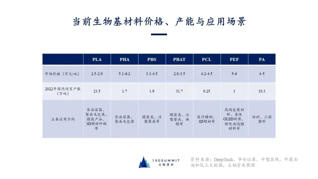 不可忽视的是,大宗商品核心是“算账”问题,即产能与成本问题。下表总结了主要生物基材料的性能、价格与具体应用场景。