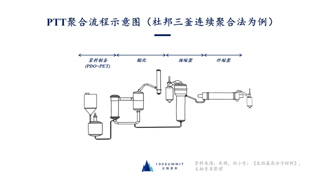 仍然以PTT纤维生产为例。在得到核心单体PDO后,仍然需要与精对苯二甲酸(PTA)或对苯二甲酸二甲酯(DMT)进行聚合。生产流程如下图所示。
