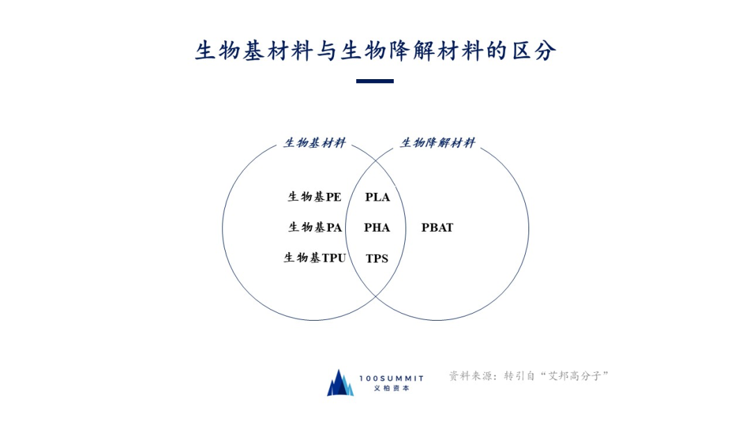与石化基材料不同,生物基材料侧重于其原料来源为生物质,核心是含有“生物碳”,即碳-14。因此,严格意义上, “生物基材料”与“生物降解材料”二者并不完全重合。