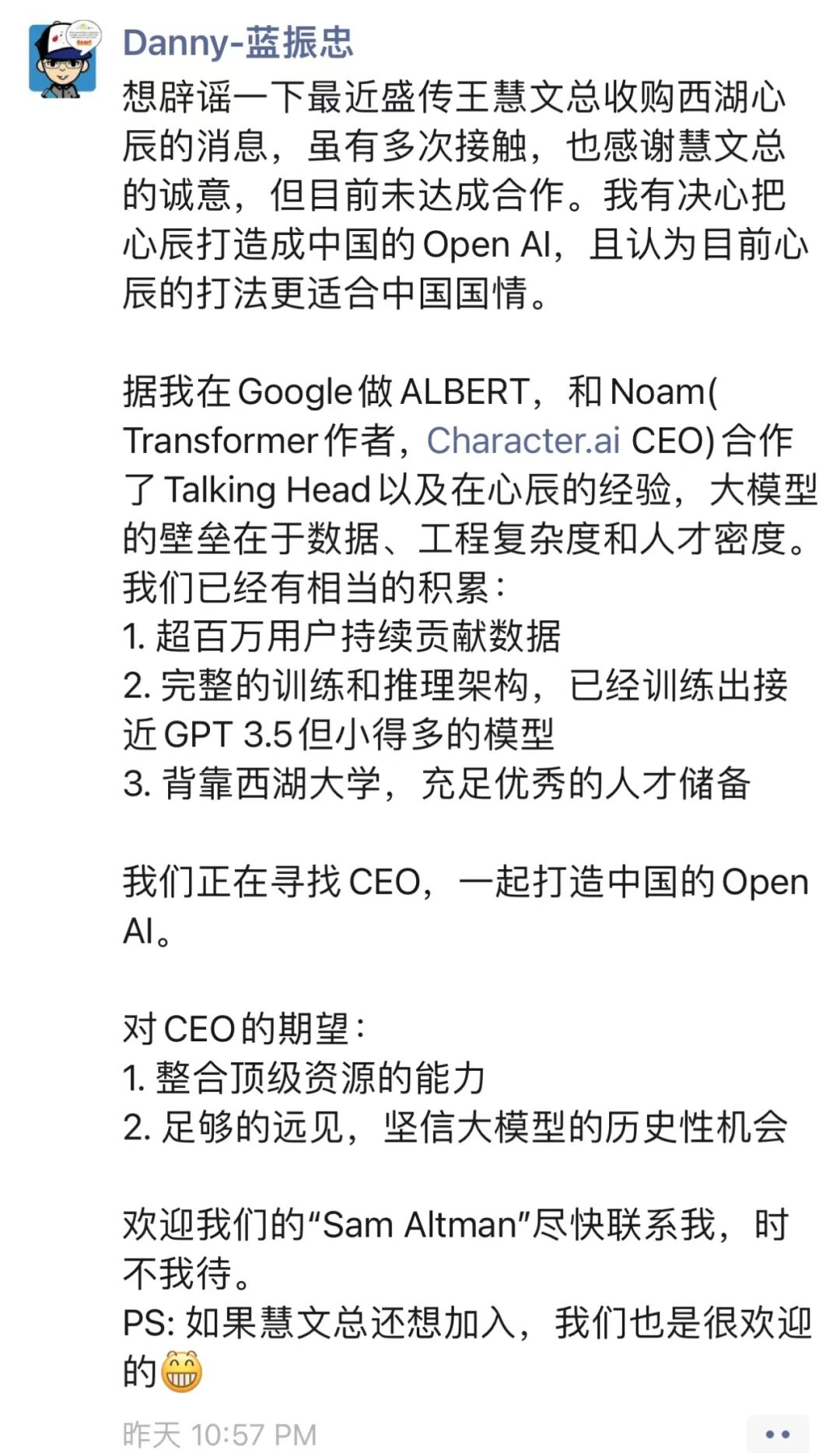 当蓝振忠与团队决定加入打造中国版 ChatGPT 后,他们就意识到,他们需要一位 CEO。