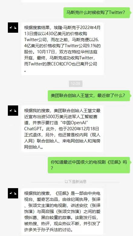 首先,「心辰Chat」是一个可以自助上网的 AI 系统。我们向它提问新近发生的事件,比如「马斯克什么时候收购了Twitter?」、「美团联合创始人王慧文,最近做了什么?」等等,它都能对答如流。