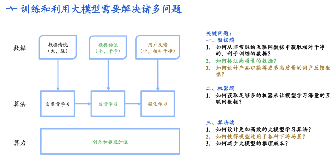 如上图所示,大模型的研发需要解决诸多问题,左图中从右往左,黄色部分到绿色部分、再到黑色部分,研发环节会越来越底层,难度越大、研发投入也需要更多。目前,大多数的团队都只进行到数据端的数据标注,算法端的监督学习,而 OpenAI 是从数据清洗、自监督学习开始,从底层做起。