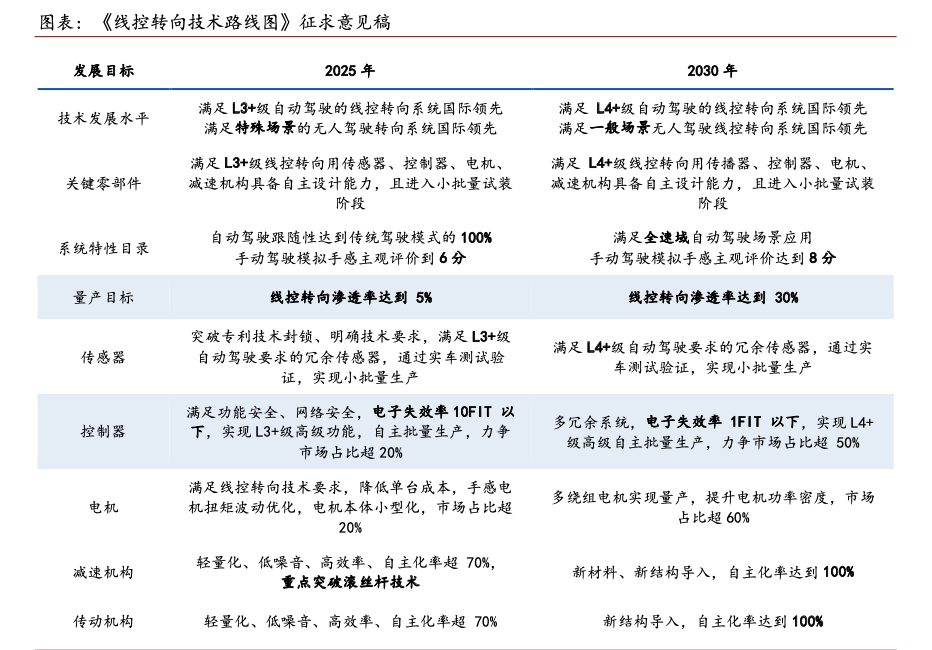 2022年 4 月,《线控转向技术路线图》征求意见稿正式发布。线控转向的总体目标是在 2025 年、2030 年分别实现国际领先的 L3+、L4+级自动驾驶线控转向系统,线控转向的渗透率分别达到 5%、30%。