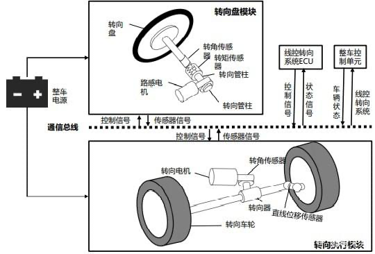 线控转向系统分为三个部分:路感模拟模块(转向盘模块)、转向执行模块和中央控制单元(ECU)。转向盘模块包括方向盘转矩、转角传感器,路感电机及其减速器等部件;转向执行模块包括直线位移传感器、转角传感器、转向电机及其减速机构等部件;另外线控转向系统还包括转向控制器和电源等部件。