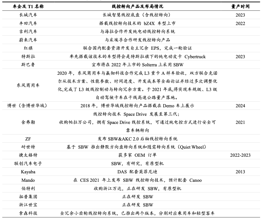 此外,新国标放宽了物理解耦的法律约束,有利于线控转向系统进一步落地。2022 年 1 月 1 日,汽车转向系统新国标正式实施,取代已经执行超过20年的GB 17675-1999,新国家转向标准的重要变化是将解除以往对转向系统方向盘和车轮物理解耦的限制。目前,国外已经放开线控转向上车的相关法规限制,允许线控转向量产。