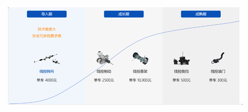 其中,线控底盘技术主要包括线控转向、线控油门、线控换挡、线控制动、线控悬挂等五大系统。从产品生命周期角度来看,五大细分模块中线控驱动和换挡基本进入成熟期,线控制动和悬架正处成长期,线控转向迈进导入期。