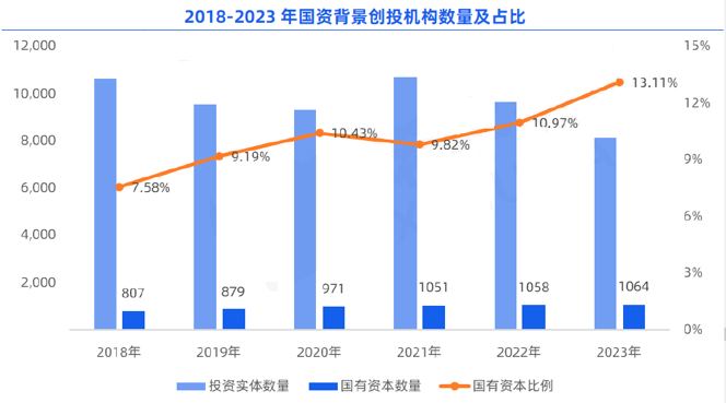 财联社数据显示,2023年国资背景的投资机构活跃度上升较为明显,除深创投、深圳高新投出手50次以上之外,合肥创投、锡创投、苏高新等出手次数均超过20次。烯牛数据显示,国有资本背景机构数量连续5年正增长,从2018年的807家增至2023年的1,064家,占比从2018年的7.58%增至2023年的13.11%,已经成为创投市场中最重要的参与者之一。