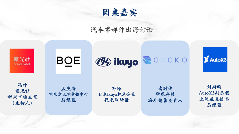 出海是最近3年的关键词,对于汽车产业链企业而言,如何在全球构建竞争力,成为了新的挑战。论坛的第一轮圆桌,主题聚焦“汽车产业链出海之路”,邀请到京东方北京营销中心总经理孟庆海、日本IKUYO株式会社代表孙峰、壁虎科技海外销售负责人诸时俊、AutoX3副总裁刘斯昀以及霞光社新兴市场主笔冯叶参与本次圆桌的讨论。圆桌围绕中企出海的竞争优势、汽车产业链企业出海的品牌打造及全球布局策略等话题展开。作为汽车产业出海的资深参与者,圆桌嘉宾分享了在各自领域内的出海经验与破局之术,交流全球业务拓展心得。