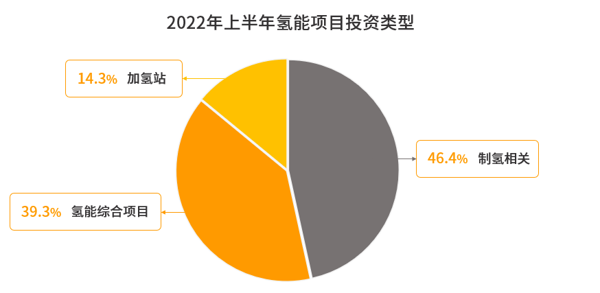 而在2022年上半年,势银能链统计数据(根据公开内容整理,或有遗漏)显示,国内氢能与燃料电池产业投融资项目已达54个,总计投资金额上千亿元。其中,涉及制氢的项目13个,在氢能项目中占比46.43%。
