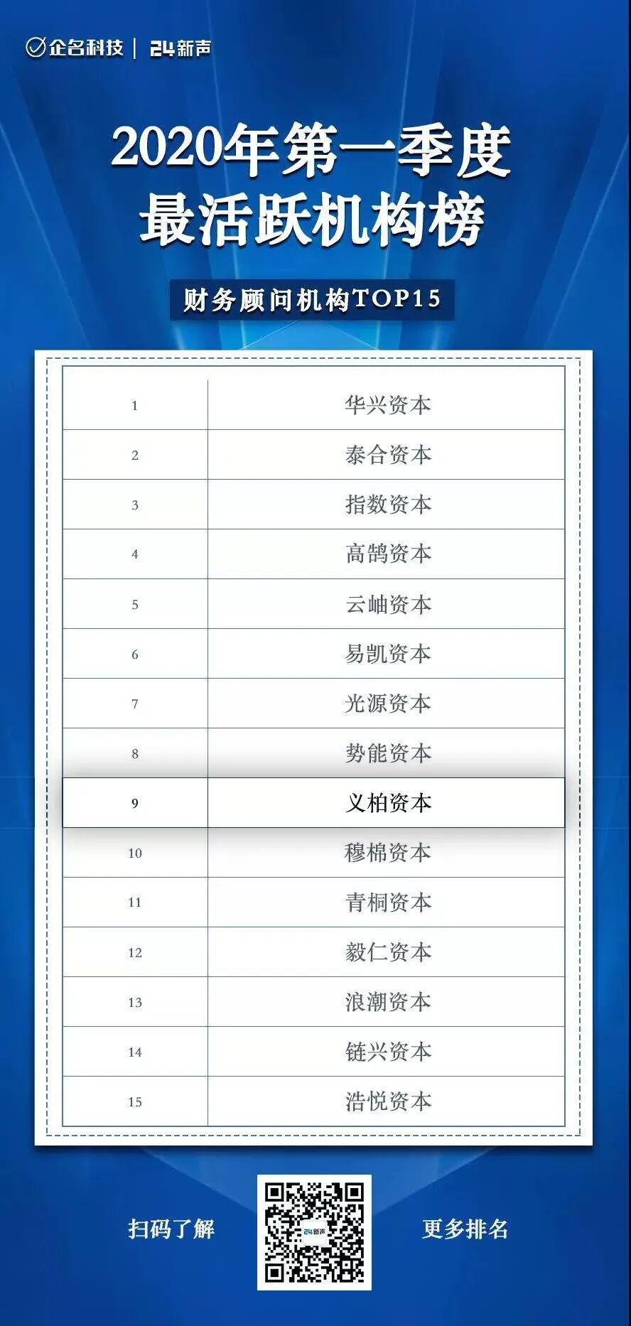 义柏荣誉|义柏资本斩获2020年第一季度最活跃财务顾问机构奖