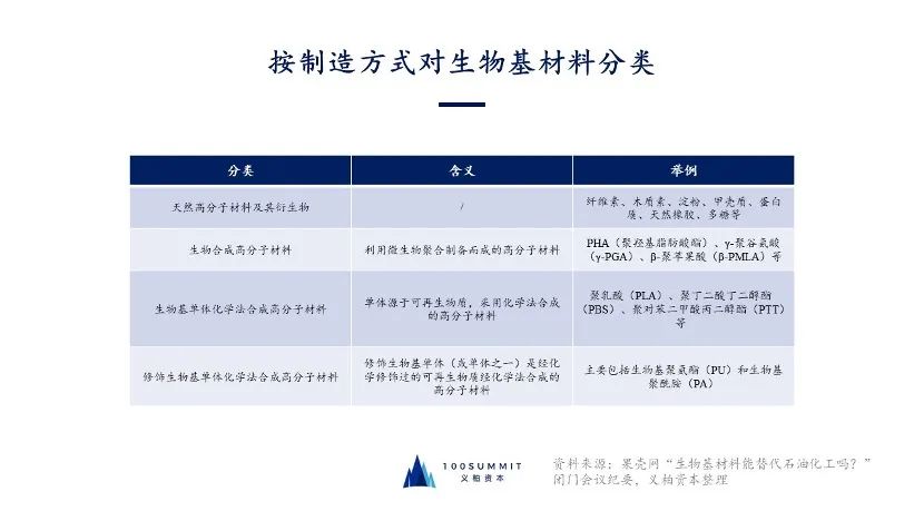 按照制造方式分类,生物基材料可分为以下四类:天然高分子材料及其衍生物;生物合成高分子材料;生物基单体化学法合成高分子材料、修饰生物基单体化学法合成高分子材料,后两者均属化学合成路径。
