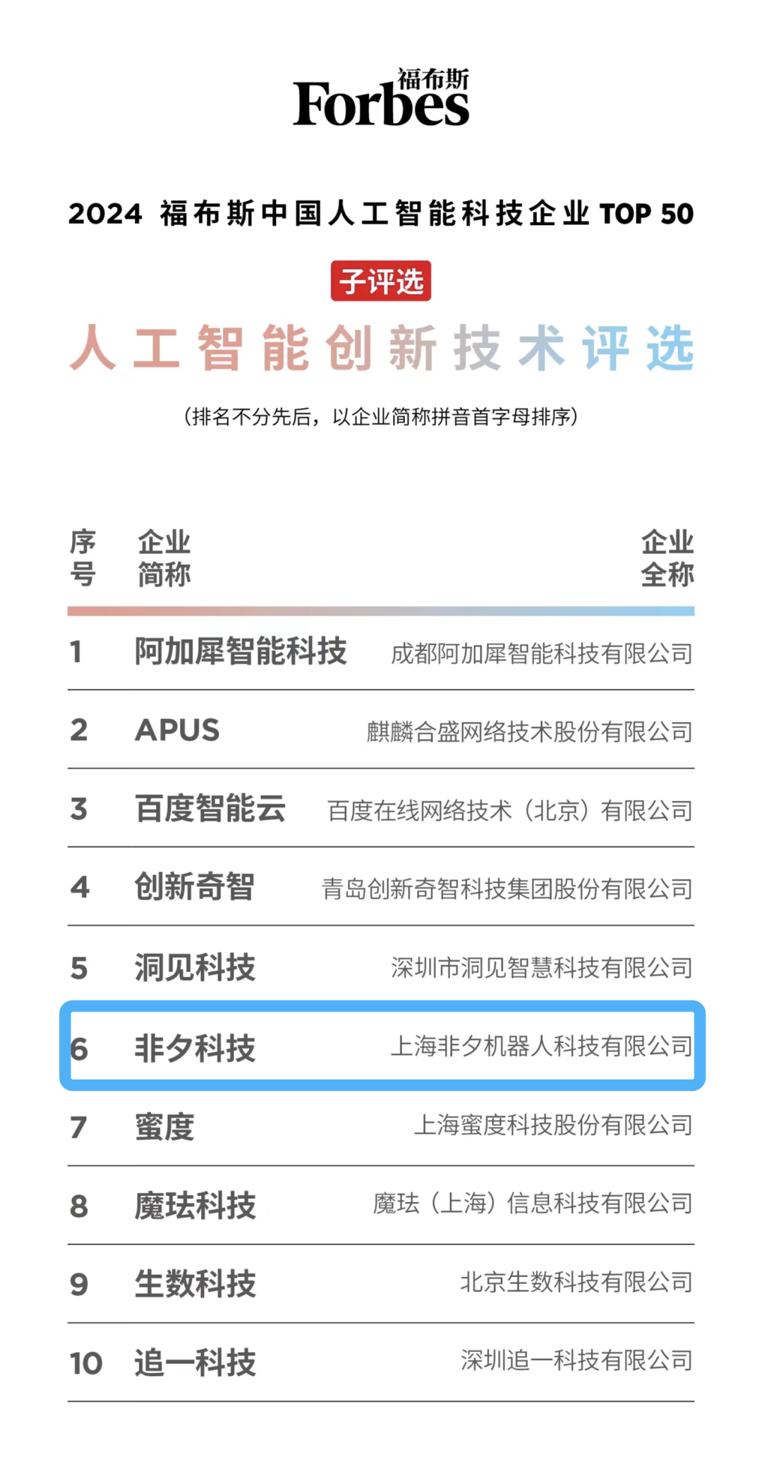近日,福布斯中国发布“2024人工智能科技企业评选”榜单。本次评选从人工智能产业的技术发展、应用场景、产业生态和市场规模等多维度进行分析,历时七个月,最终评出在中国人工智能产业拥有突出表现的企业。