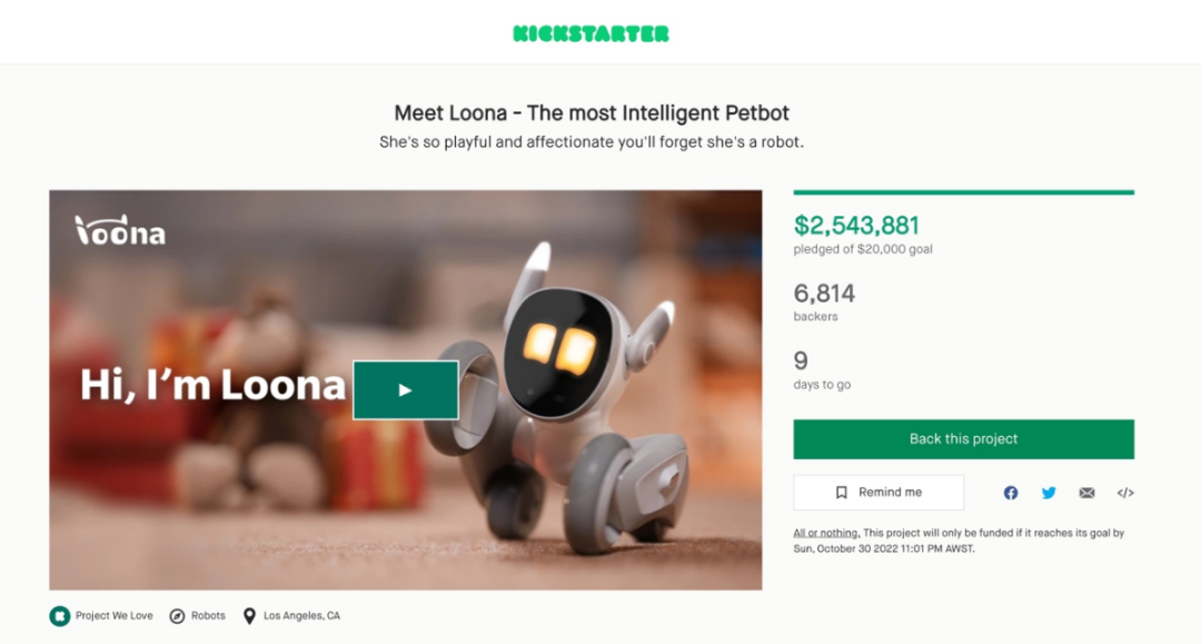 此后,Loona在Kickstarter众筹仅用半月时间销售额突破200万,成为Kickstarter平台第三季度Top 2爆款。目前,Loona有望实现众筹总额超300万美元,成为Kickstarter消费机器人历史众筹第一。