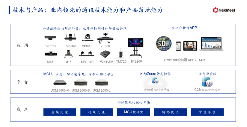 目前国内的视频会议厂商主要分为两类:一类是仅提供云视频会议的SaaS软件服务的公司,如Zoom和互联网巨头;另一类则是重会议即“软件+硬件+服务“,覆盖大G大B用户,要具备同时输出SaaS产品,PaaS产品,云硬件产品和研发级服务的能力,如思科、华为、宝利通。区别于轻会议场景,重会议更侧重深耕产业互联网的不同复杂场景。也正因于此,重会议对视频软硬件系统品质、稳定性、安全性以及融合性提出了极高的要求。上述两者形成了市场分层,差异化的满足了市场上不同客群的需求。