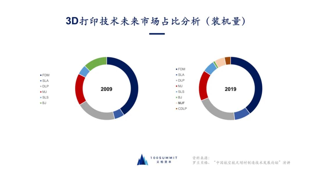 从3D打印各技术路径占比情况来看,根据罗兰贝格的预测,熔融沉积成型、数字光处理、激光选区烧结等相对成熟的传统技术仍然是市场主流技术,但连续液面生产技术、多射流熔融技术等新兴技术的占比也在逐步上升。在Stratasys、3D Systems等众多老玩家林立的局面下,创业企业一旦掌握了突破性的新兴技术,仍然具备突围的机遇。