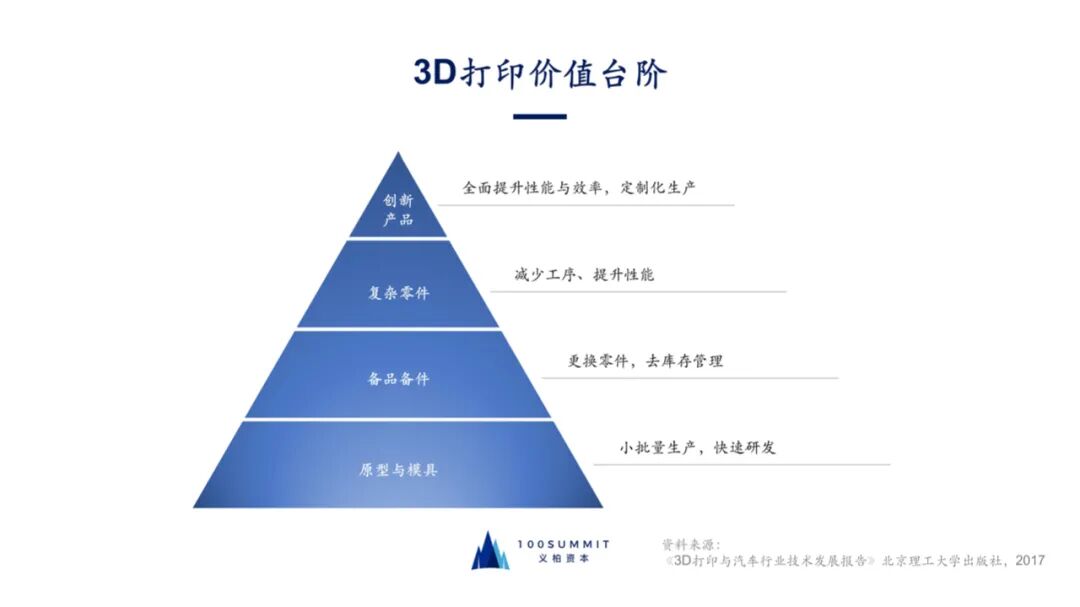 根据中国汽车工程学会与3D科学谷提出的“3D打印价值台阶”:3D打印首先适用于小批量生产原型与模具的场景。原型与模具制作的精细化以及效率要求与增材制作技术天然匹配。在这种场景中,模具质量与生产效率是最主要的考量因素。在原型与模具基础上,备品备件是第二类场景。这类场景尤其强调增材制造技术带来的“去库存管理”优势。用来更换的零部件不再需要提前生产并堆积在中心仓库中,等到需要更换的时候由中心仓库运输到各地;只要各地生产中心有一台3D打印机,就可以根据结构数据进行备品备件的生产,从而实现“如无必要,不增实体”的去库存与分布式管理效果。