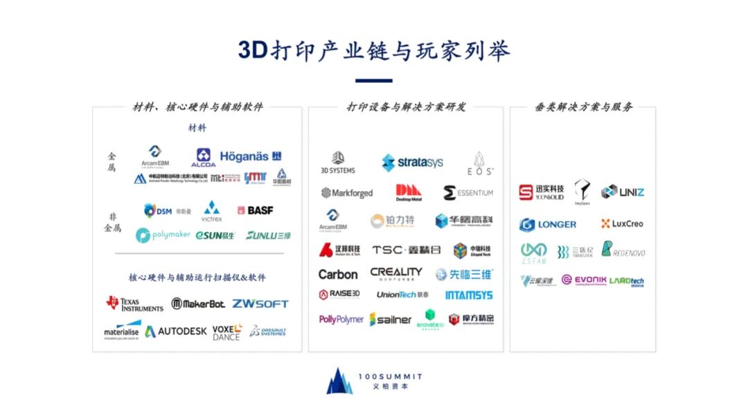 3D打印产业链可以简单划分为:材料、核心零部件与软件供应商;打印设备与打印服务商;垂直场景解决方案提供商三大类。
