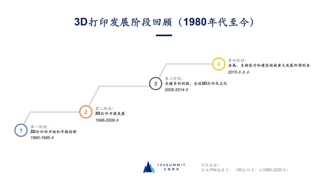 从最初的技术发明,到专利申请,大公司凭借技术垄断市场,再到关键技术专利的相继到期,3D打印进入“民主化”阶段,众多3D打印创企崛起,消费级市场与专业级市场“平分秋色”,3D打印的技术、市场、政策、创业生态都在逐渐改善。